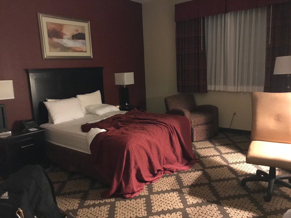 We call the Air Force Inn to see if we can check in early to get a shower and some rest, explaining about the 3 a.m. roll call. They are very accommodating and tell us to come on over. So we get rooms, a shower and several hours of sleep. Around 6:30, we’re sitting in the grill at the golf course enjoying a nice meal.