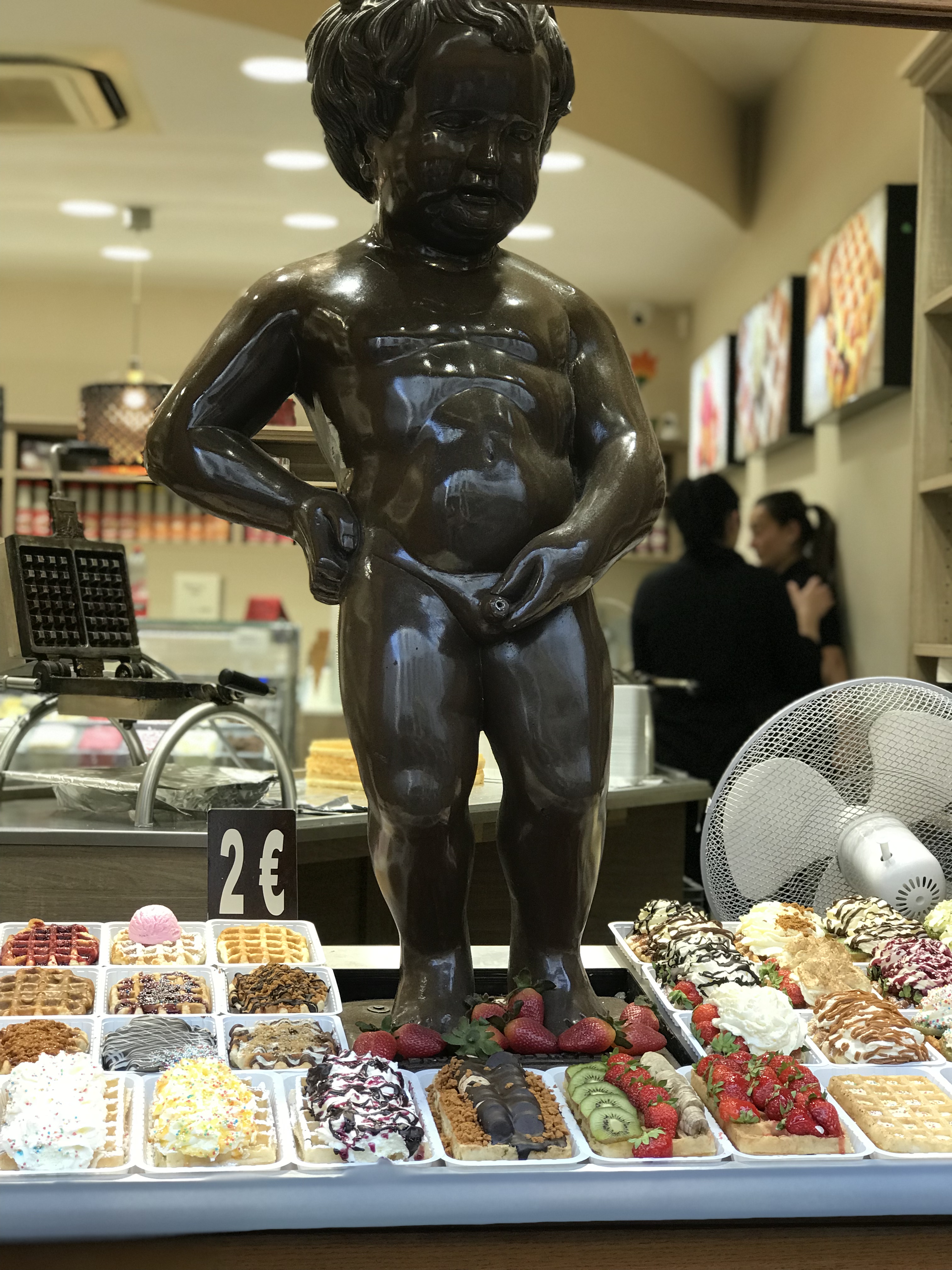 It was getting late so we started back towards the hotel and then we came across the Manneken Pis statue which had lots of tourists taking picture with it. Steven had no desire to let me get a picture of him with it, but then he probably couldn’t because of the shear amount of tourists surrounding it. Across from the statue was a chocolate shop with one in the window, posing with waffles and chocolates.