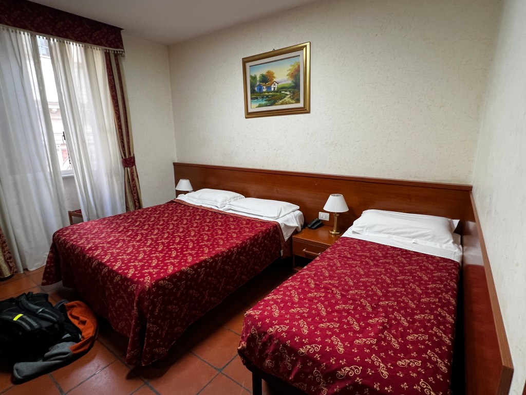 That’s what happened in Rome. I booked at a place called The Stromboli Hotel (my first mistake… picking a hotel named after food), picked because its description put it just 640 meters from the train station and after the last hotel I picked in Milan turned out to be much further because my non-metric American brain didn’t comprehend, I wanted close. The pictures of the rooms looked great, the hotel seemed to have a pleasant ambiance, and everything looked great. What’s to lose?