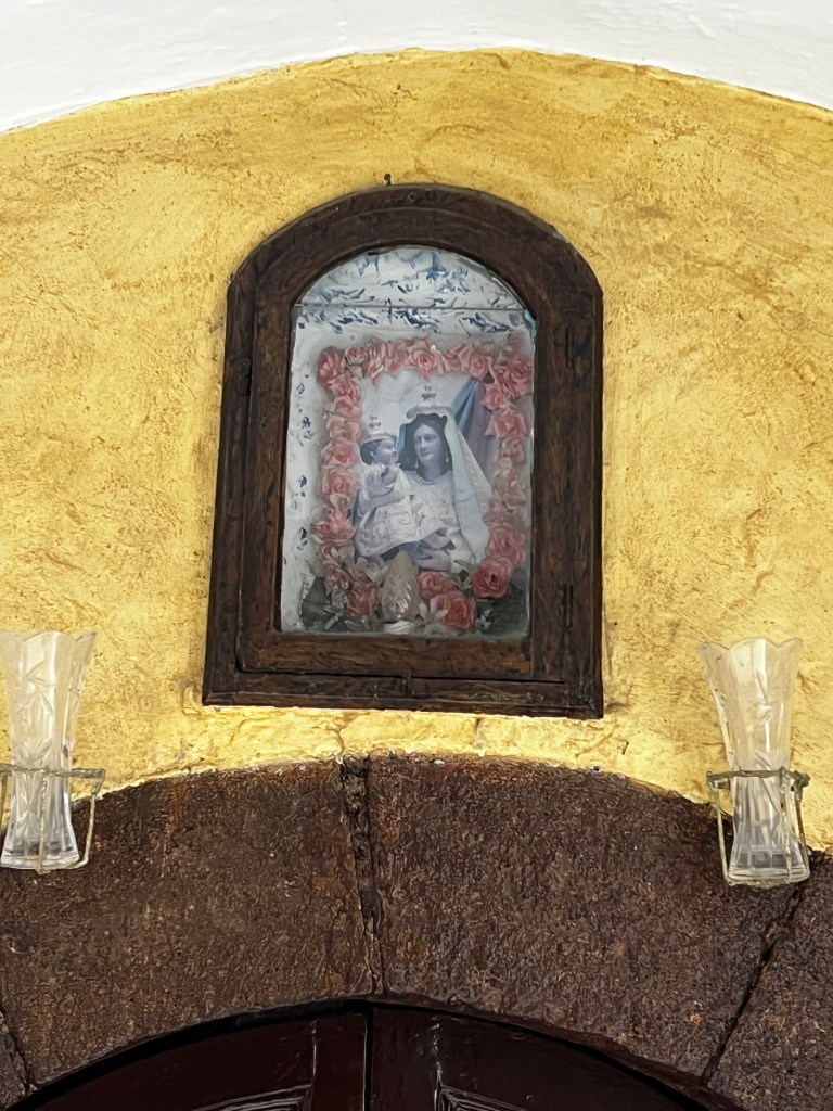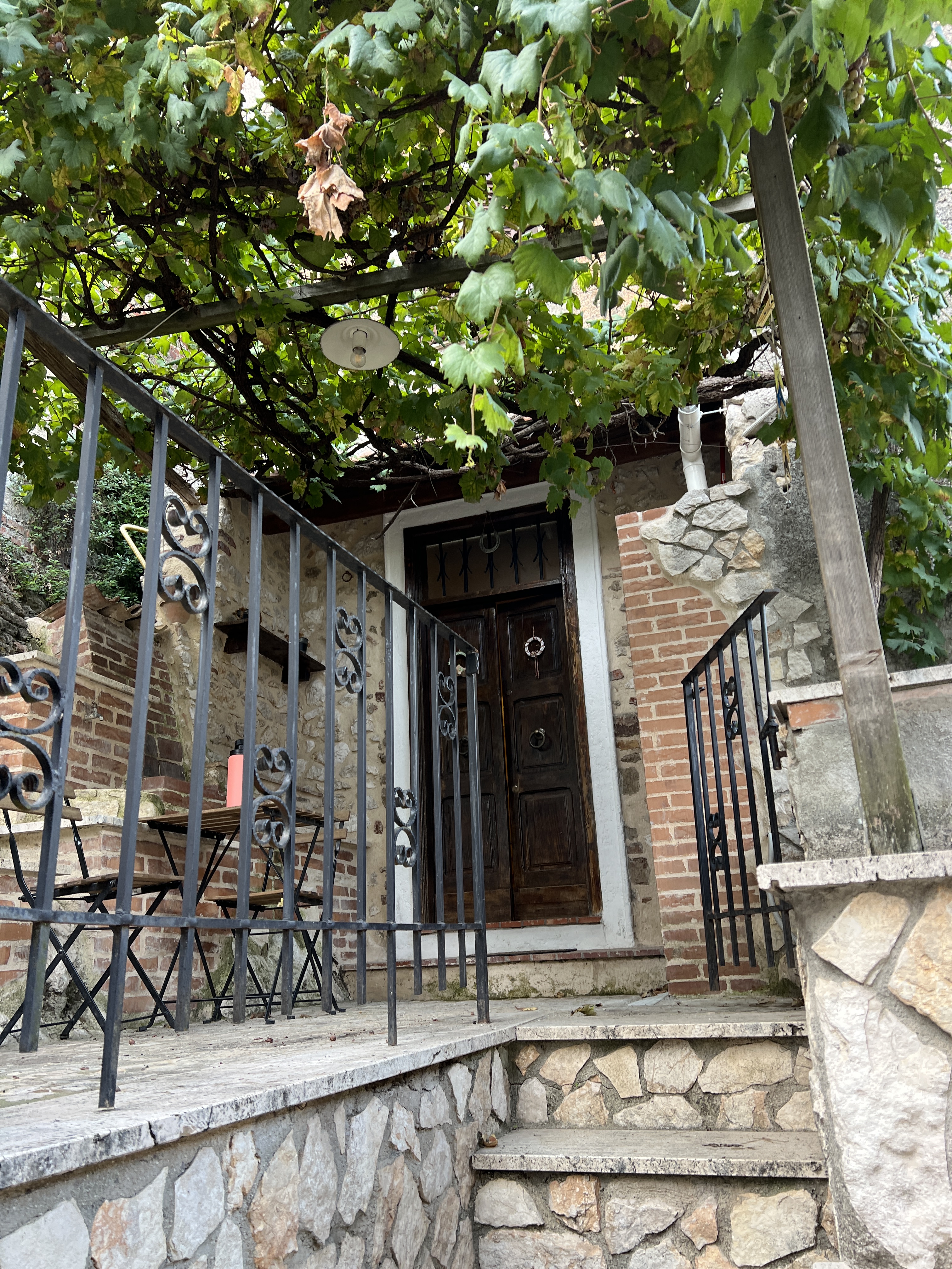 The entry of the home was magical. A beautiful, wooden double door with an adorable porch and two welcoming chairs is just what two Americans of advance aged needed! Above the table, jutting out from the mountain rock was a natural spring with fresh water for the home and it was well received to help calm our racing breathing and hearts. A canopy of grapevines and grapes hung overhead, providing natural shade, although much of the sweetened fruit had been enjoyed by birds.