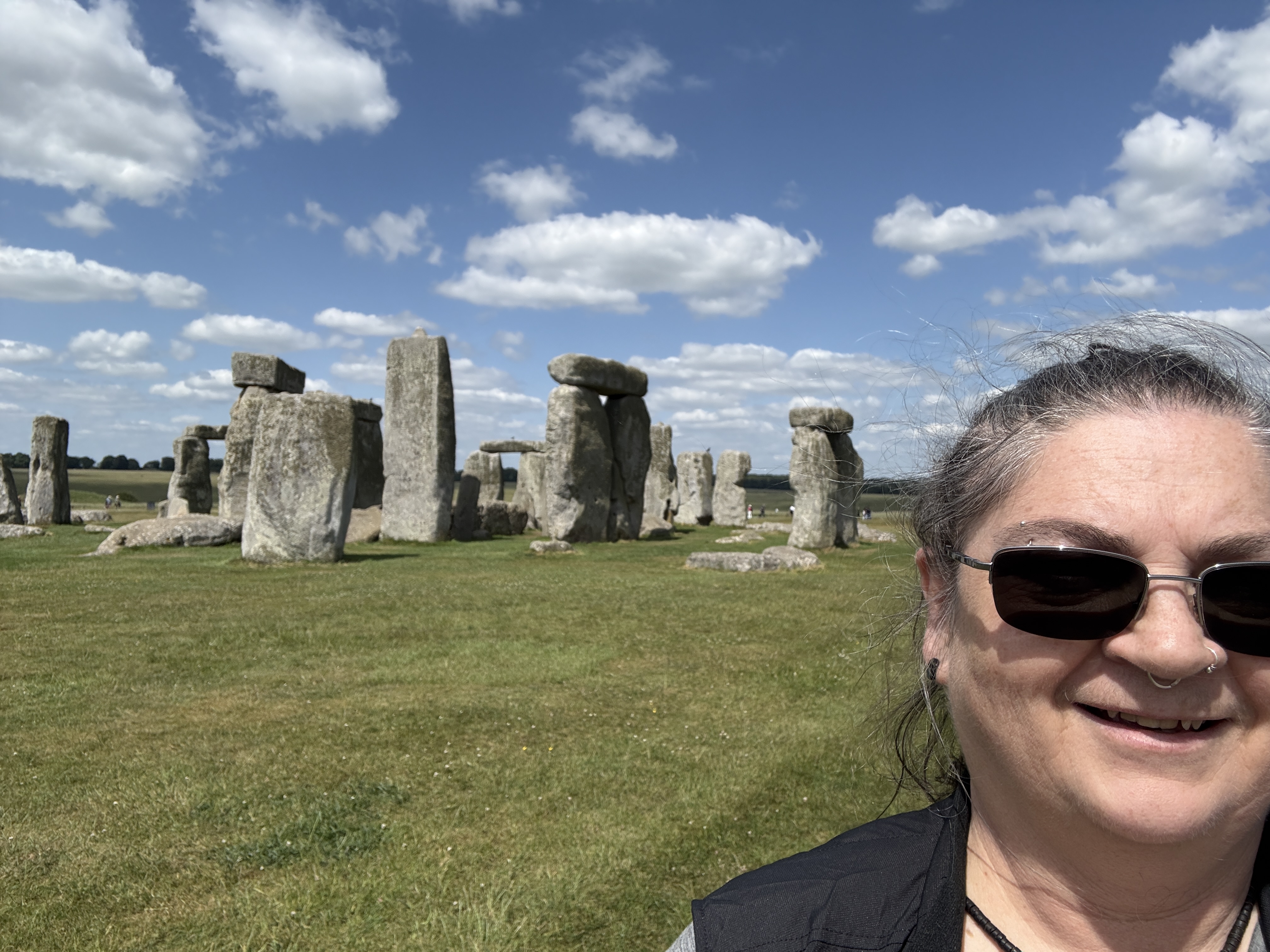 Next, we made our way to Stonehenge. There was quite a bit of traffic to work through, and the parking/entrance to the historic landmark had change since the last time I saw it 20 years ago. This trip we had to drive quite a bit past it and around the corner to come in behind it. They’ve built a large entrance way with a grift shop, bathrooms, children’s playground and bus service to the henge. You can of course, still walk to it if you like, but I’m getting old so I took the comfortable form of transportation. You can no longer go right up to touch the stones, but have to follow a circle pathway a safe distance from the stones. We met a Scottish security guard walking around Stonehenge and he answered a few questions we posed to him. I walked away to allow him to continue on his rounds, but Auntie had made a new friend and continued to talk to him. When Uncle and I caught up to them again, the Scottish security guard said to Uncle, “I hear we’ve had a wee bit of trouble in the round-a-bouts, ‘eh?” I busted out laughing and said I couldn’t believe Auntie told the security guard about Uncle’s driving skills.