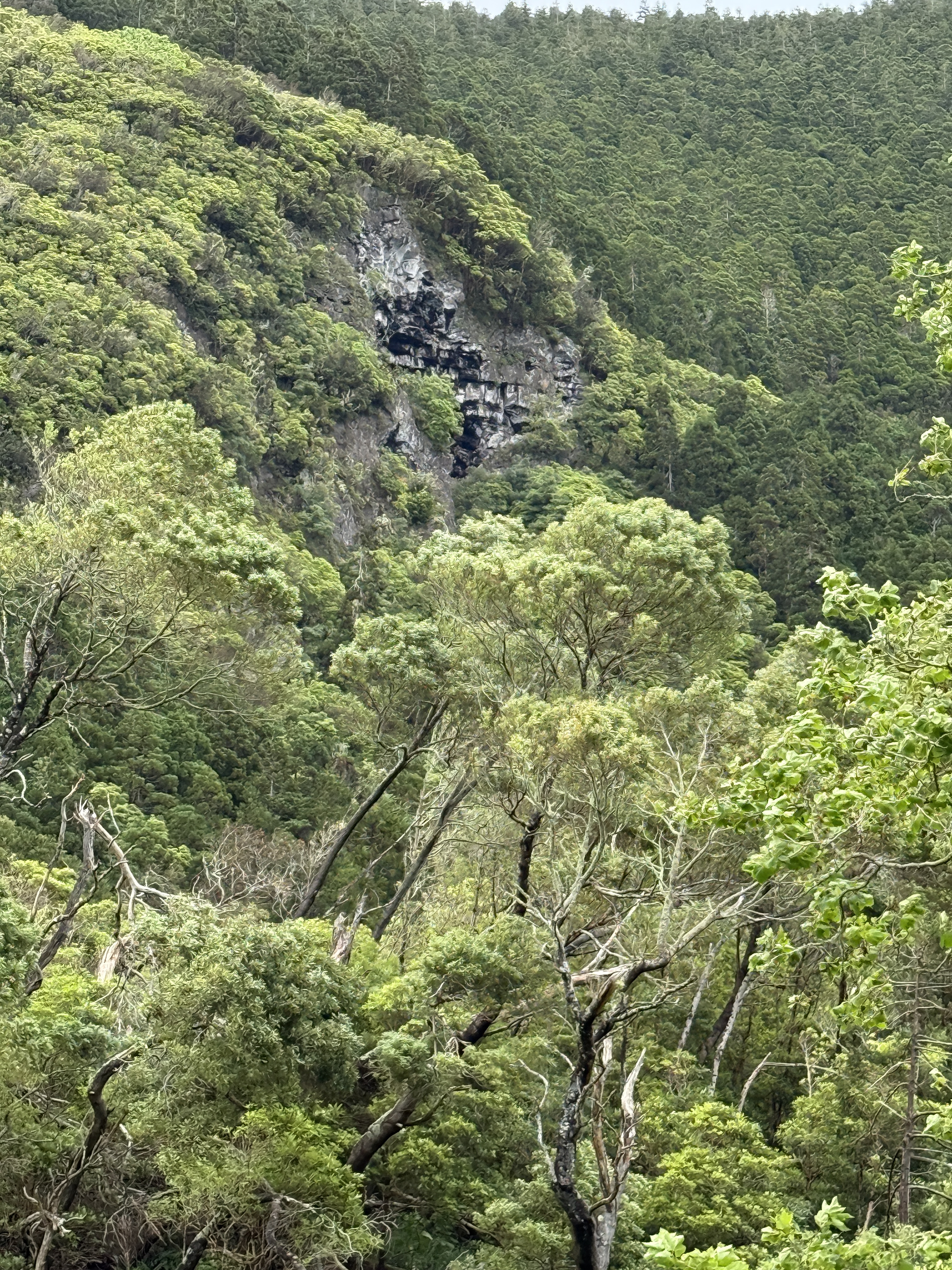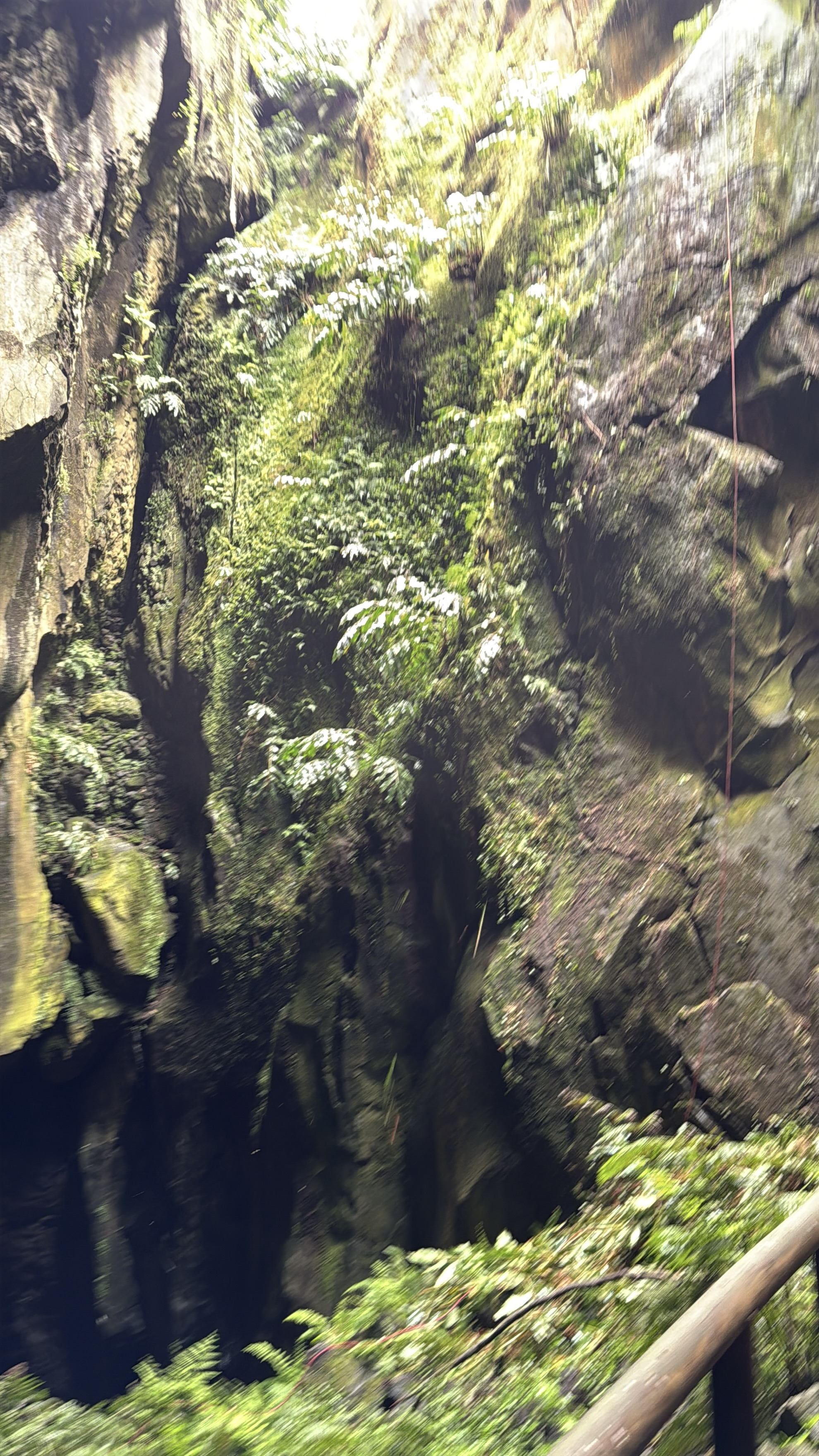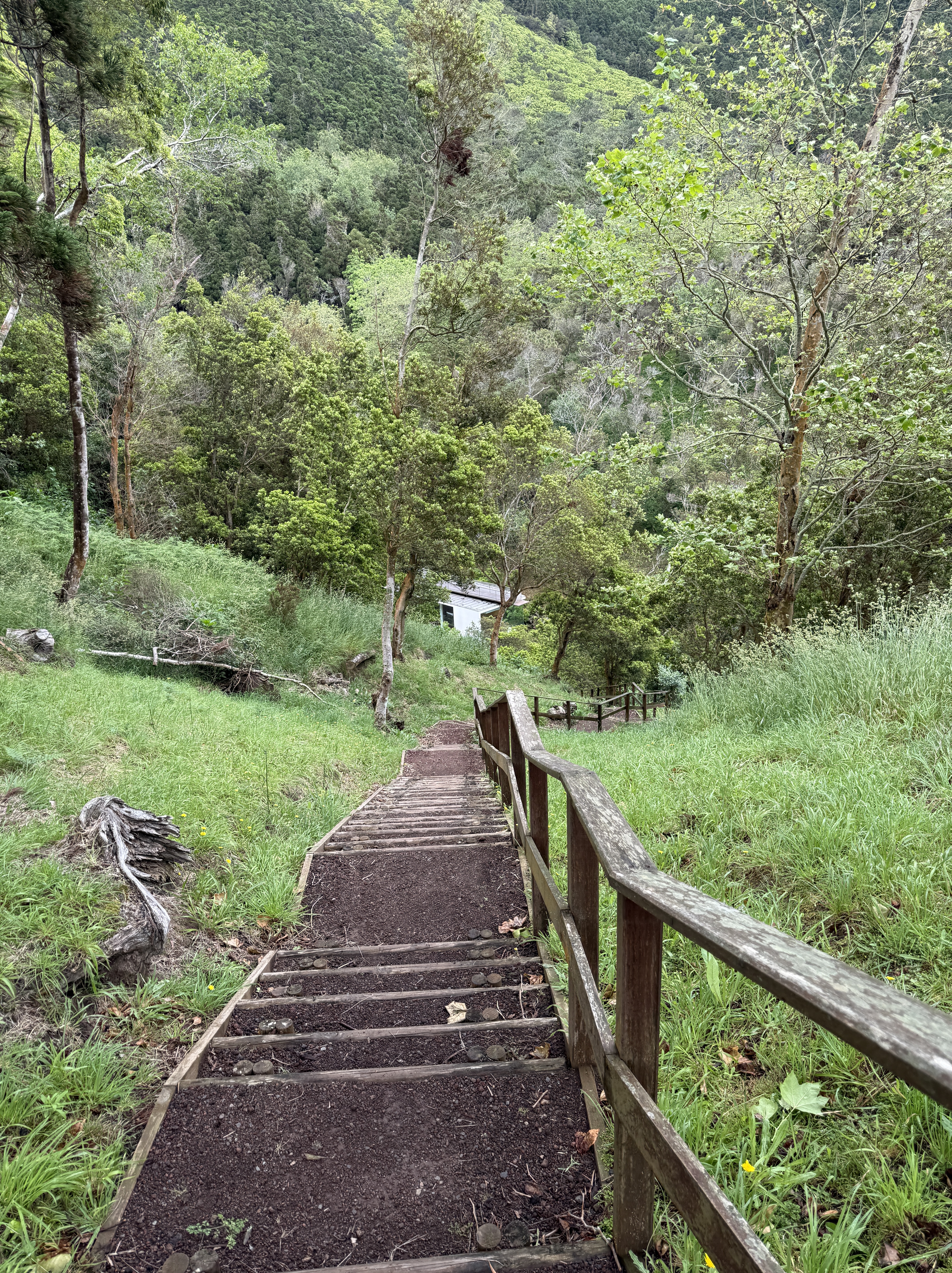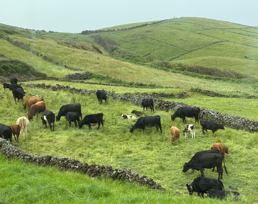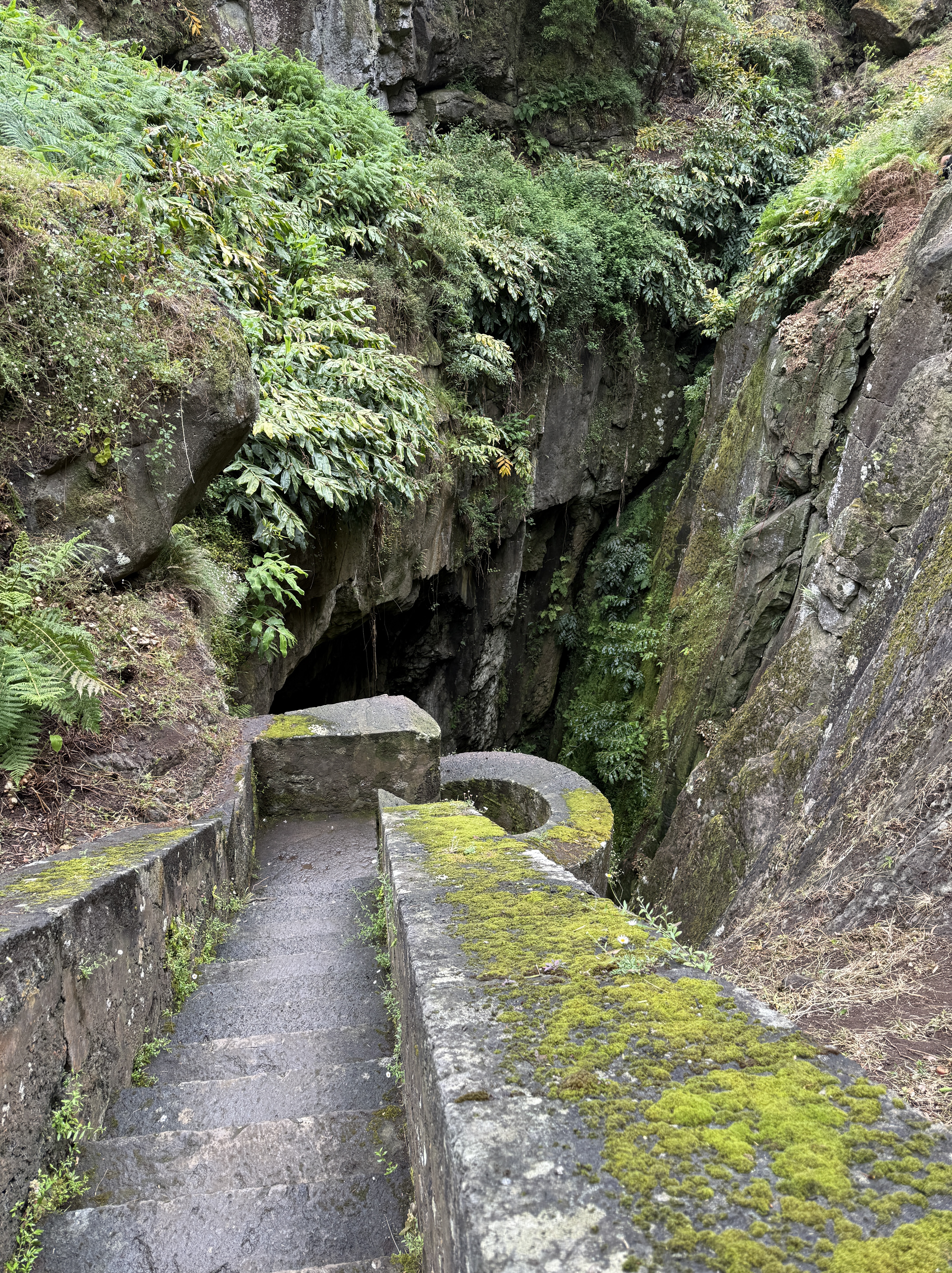 Saturday, we drove around the island and ventured to the site of an active, but dormant volcano. Furna do Enxofre (Sulphur Cave) is located in the Calderia da Graciosa, the volcanic crater which is classified as a regional natural monument. We decided to walk down to the entrance of the cave which was about 200 steps down the side of the crater. Once down, we saw the welcome center… and the road we could have driven down, which would have been welcomed a short time later. We went inside to learn that the air was safer to breath today… low sulphur gases being released, probably still not a good idea for a severe asthmatic, but as I am not one to back out of an adventure, I said why not… low sulphur … my asthma should be fine.