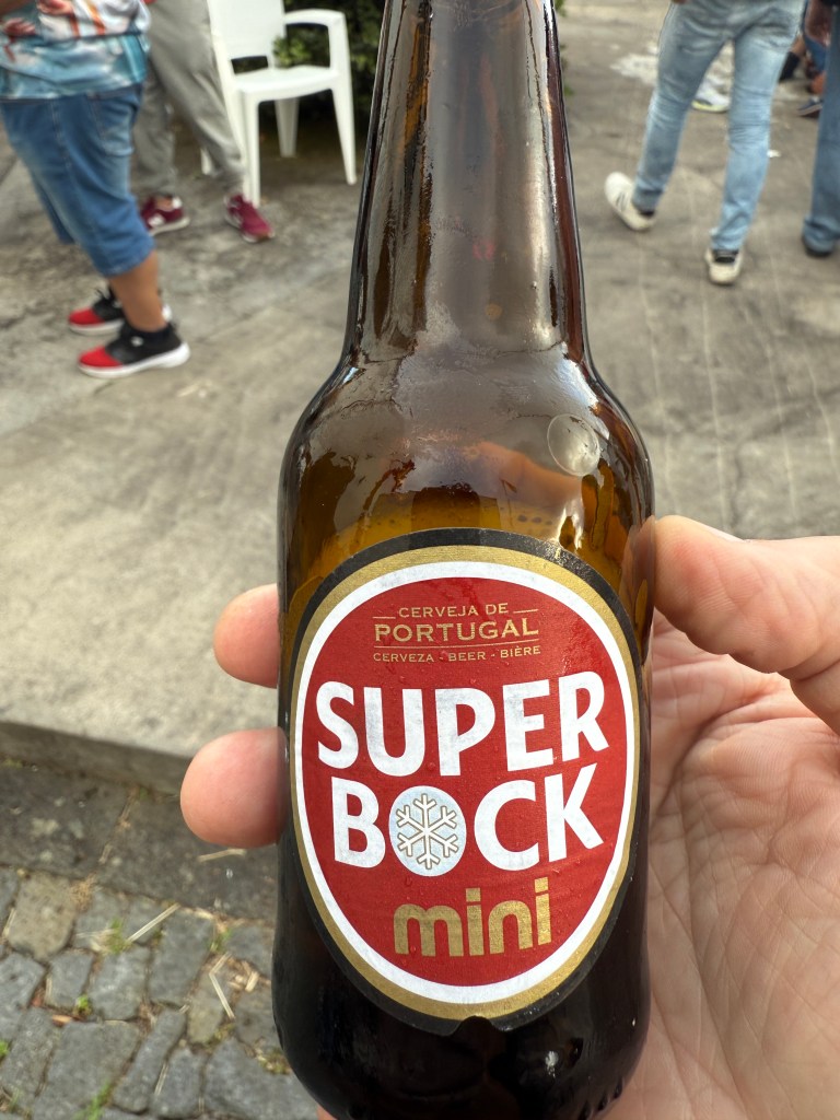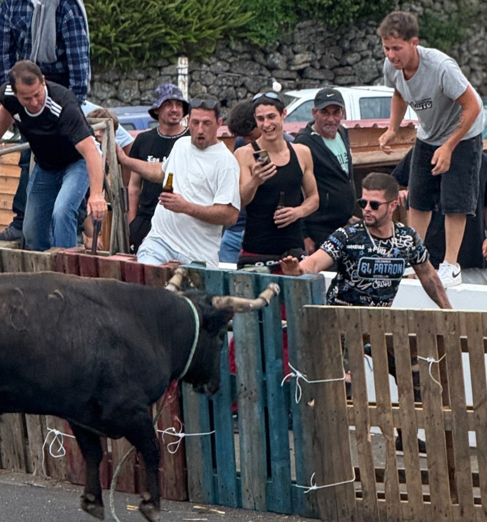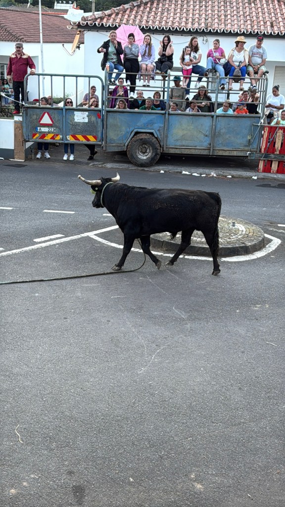 In the evening, we went to another local village who was hosting the “running of the bulls.” What a fun evening! It was a carnival-like atmosphere, with food and drinks being sold… if you have the opportunity to try Super Bock, do so. It’s a Portuguese beer and absolutely delicious! There was also an auction selling pigs and of course, the bulls. They had four young bulls, which they released separately with them tied to a rope so they couldn’t run away. They had plenty of cowboys on hand to control the bulls so that no one, bull or human, would be injured. Young men would taunt the bulls to try to get them to charge at them like a bull fighter. It was a fascinating tradition to watch.