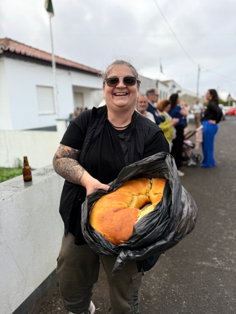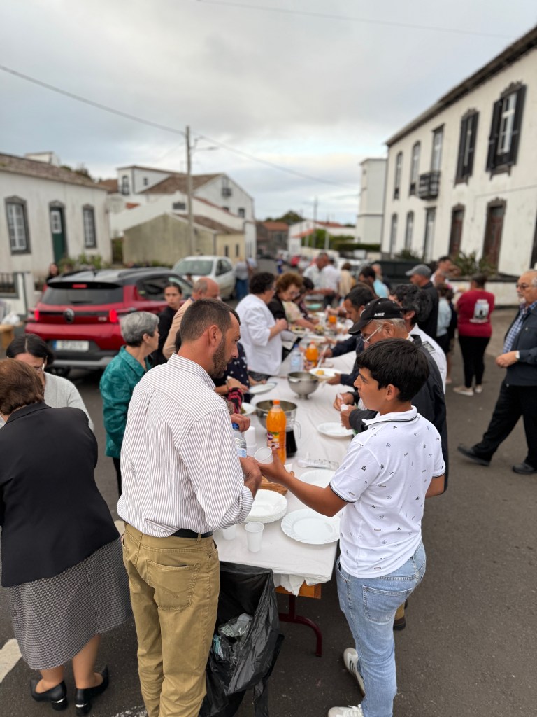 The next night, in the same little village, they held the community feast in the middle of the town, right in the street. The evening was a wonderful tradition where they have a communal meal, feeding everybody in the community together. The menu included a simple, but absolutely amazing cabbage and potato soup, then a main dish of pork. Wine, juice and bread were also offered. Everyone was having a good time, enjoying each other’s company. I met more cousins, including Victor’s sister, Manuela, who flew in from Tereceria, as well. Her daughter lives on Graciosa so she was visiting her for the weekend too. I also met a U.S. Navy sailor named Paul, who was on the USS Midway during the Regan years during the Iran hostage crisis After he left the Navy, we came back to Graciosa where he was born.