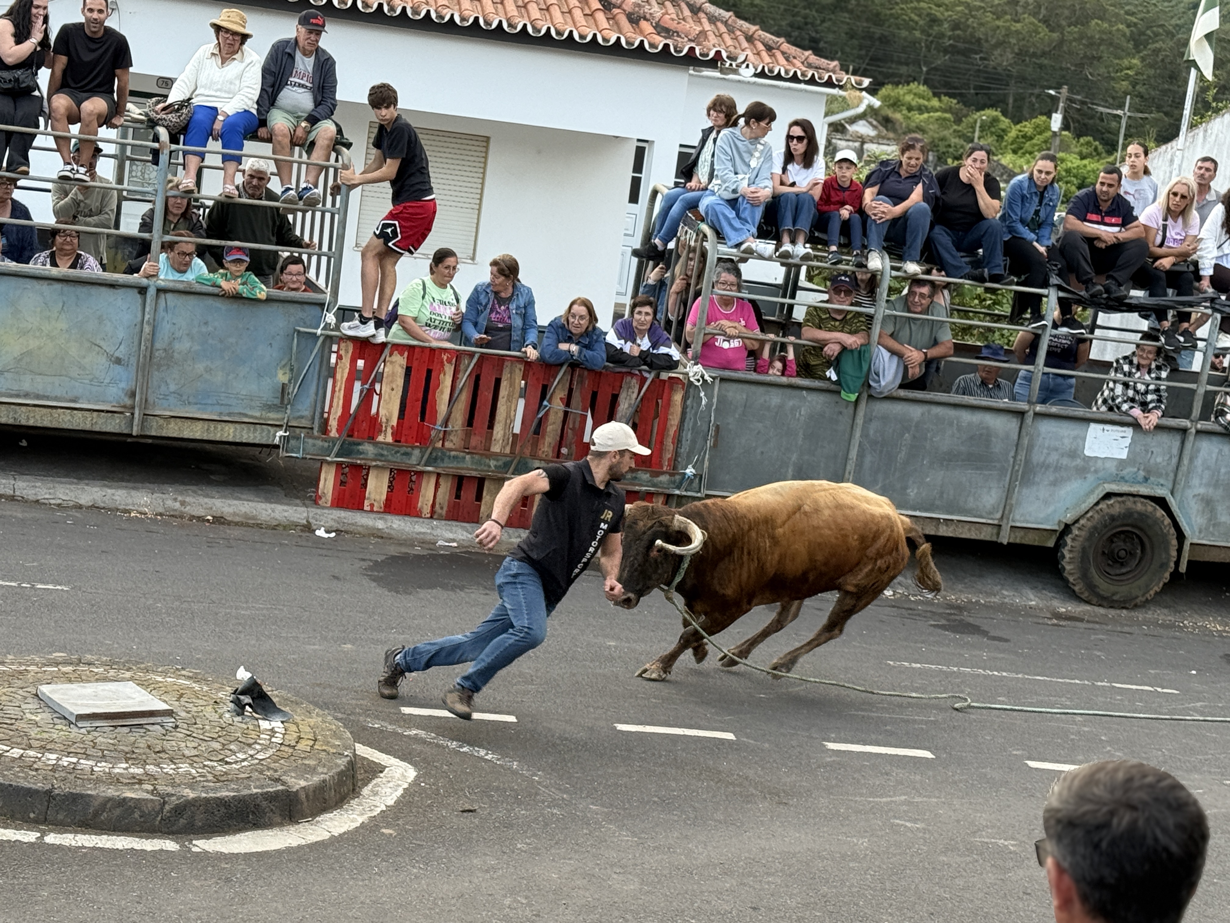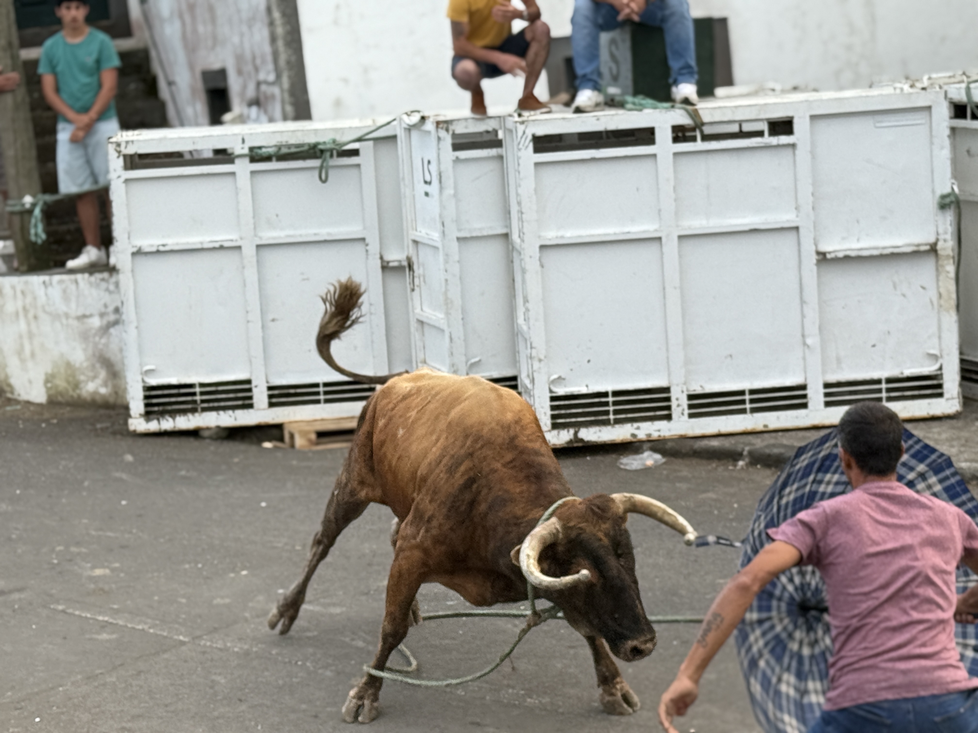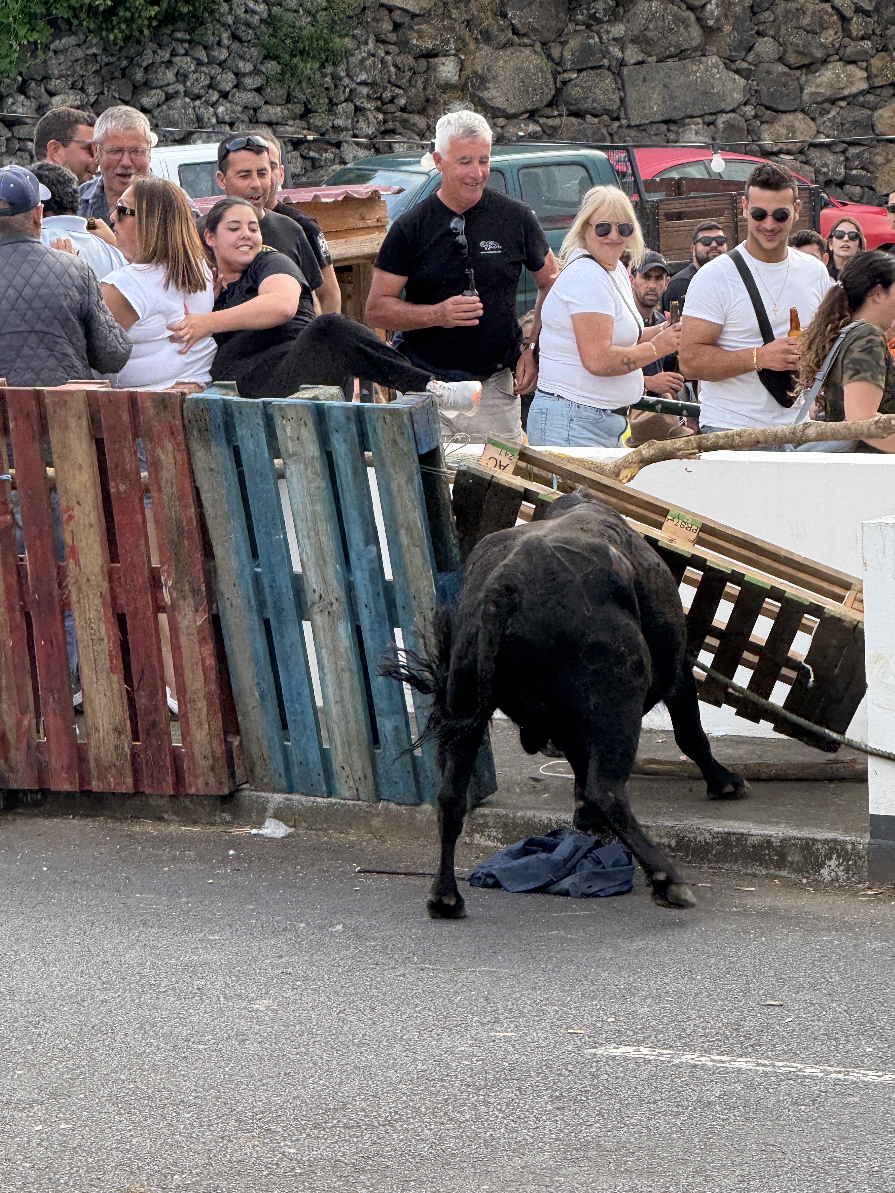 In the evening, we went to another local village who was hosting the “running of the bulls.” What a fun evening! It was a carnival-like atmosphere, with food and drinks being sold… if you have the opportunity to try Super Bock, do so. It’s a Portuguese beer and absolutely delicious! There was also an auction selling pigs and of course, the bulls. They had four young bulls, which they released separately with them tied to a rope so they couldn’t run away. They had plenty of cowboys on hand to control the bulls so that no one, bull or human, would be injured. Young men would taunt the bulls to try to get them to charge at them like a bull fighter. It was a fascinating tradition to watch.