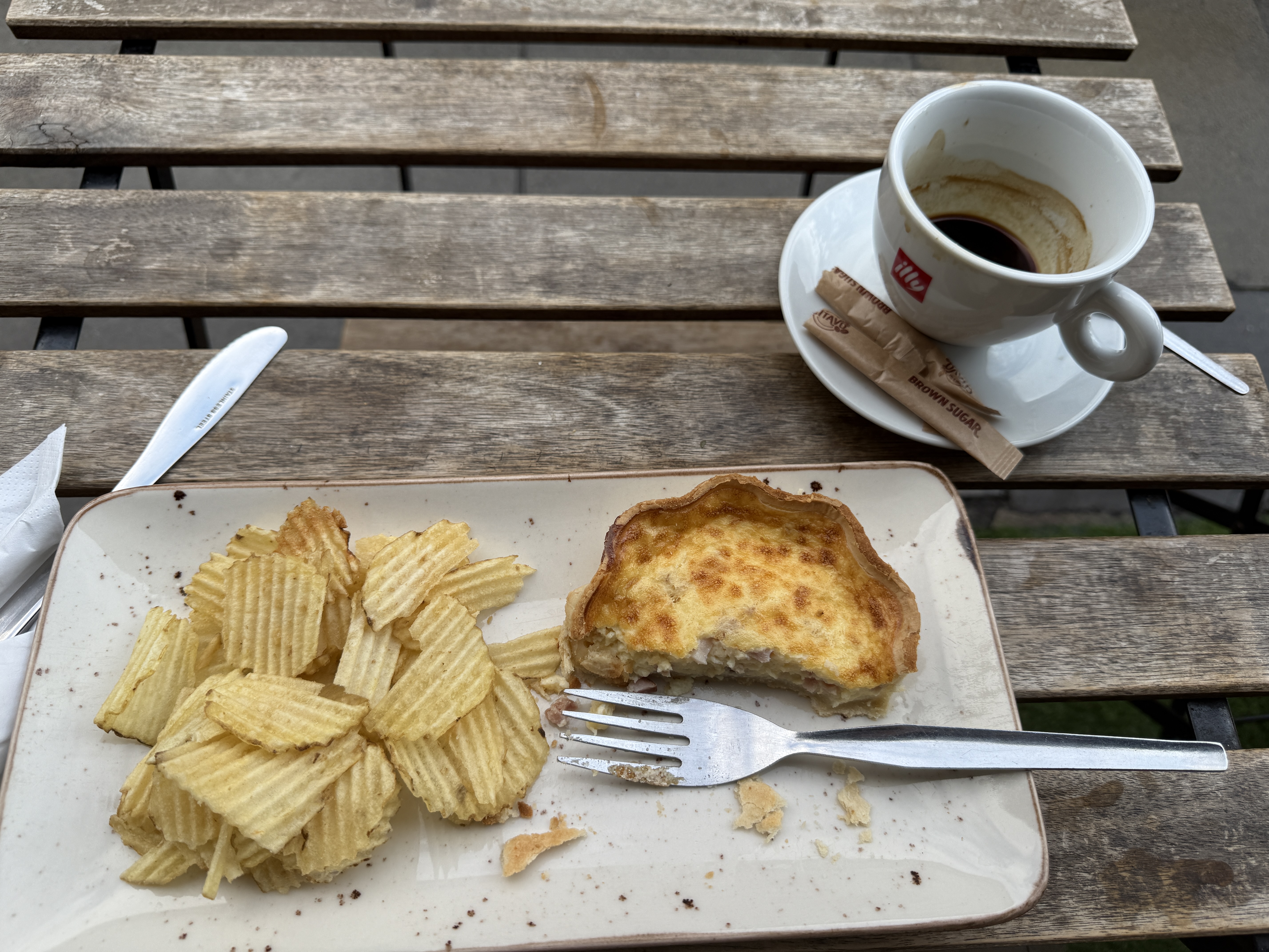 The next morning, I remember seeing a small café on the way to the restaurant, so I headed there to grab an espresso and a quiche… it came with the tastiest chips I later learned were onion and cheese favored. Potato chips for breakfast is a great way to start the day! Carol and Don met up with me at the cafe, as they had already been enjoying an early morning walk.