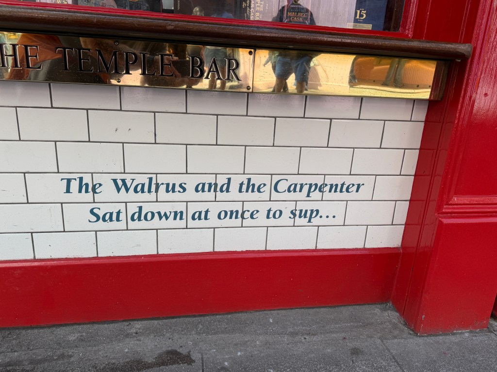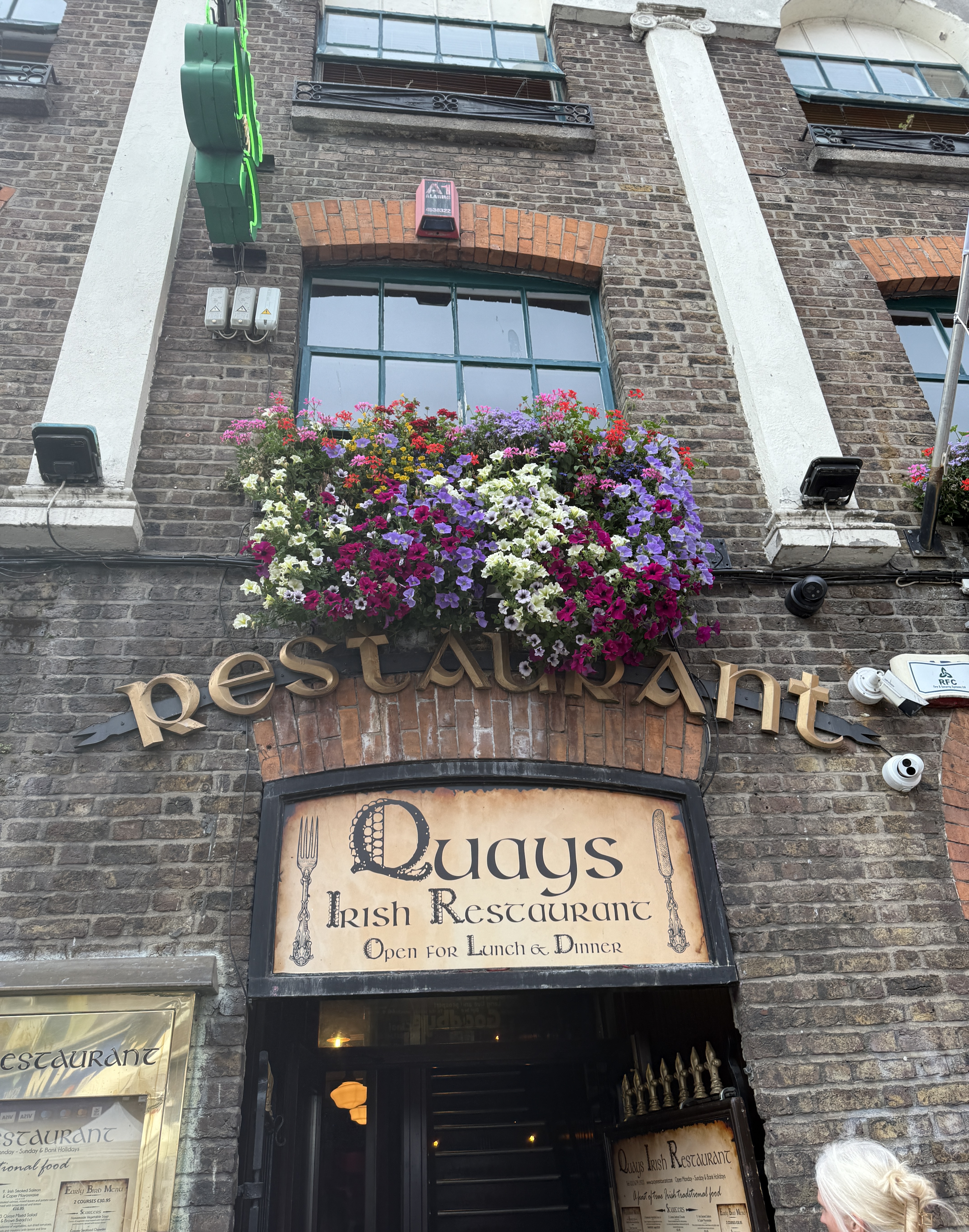 We meet up again in the early evening for a walk to where Carol has made reservations at Quays Irish Restaurant for the evening meal. We’re seated late, about 40 minutes past our reservation time of 8pm, but the meal was worth the wait! It was absolutely a wonderful meal and the desert… Bailey’s Cheesecake and Dublin Bread Pudding melted in our mouths. We have a wonderful evening catching up and then a short walk to Temple Street, the location of Dublin’s night life, brought us to the famous Temple Bar, first opened in 1840. I take a picture with my father and it makes my day! The thought of my almost 80-year-old father flying in from Bermuda, me from Tennessee (notice I’m not giving my age! LOL), and we’re meeting in Dublin, Ireland is outrageous… wonderful memories!